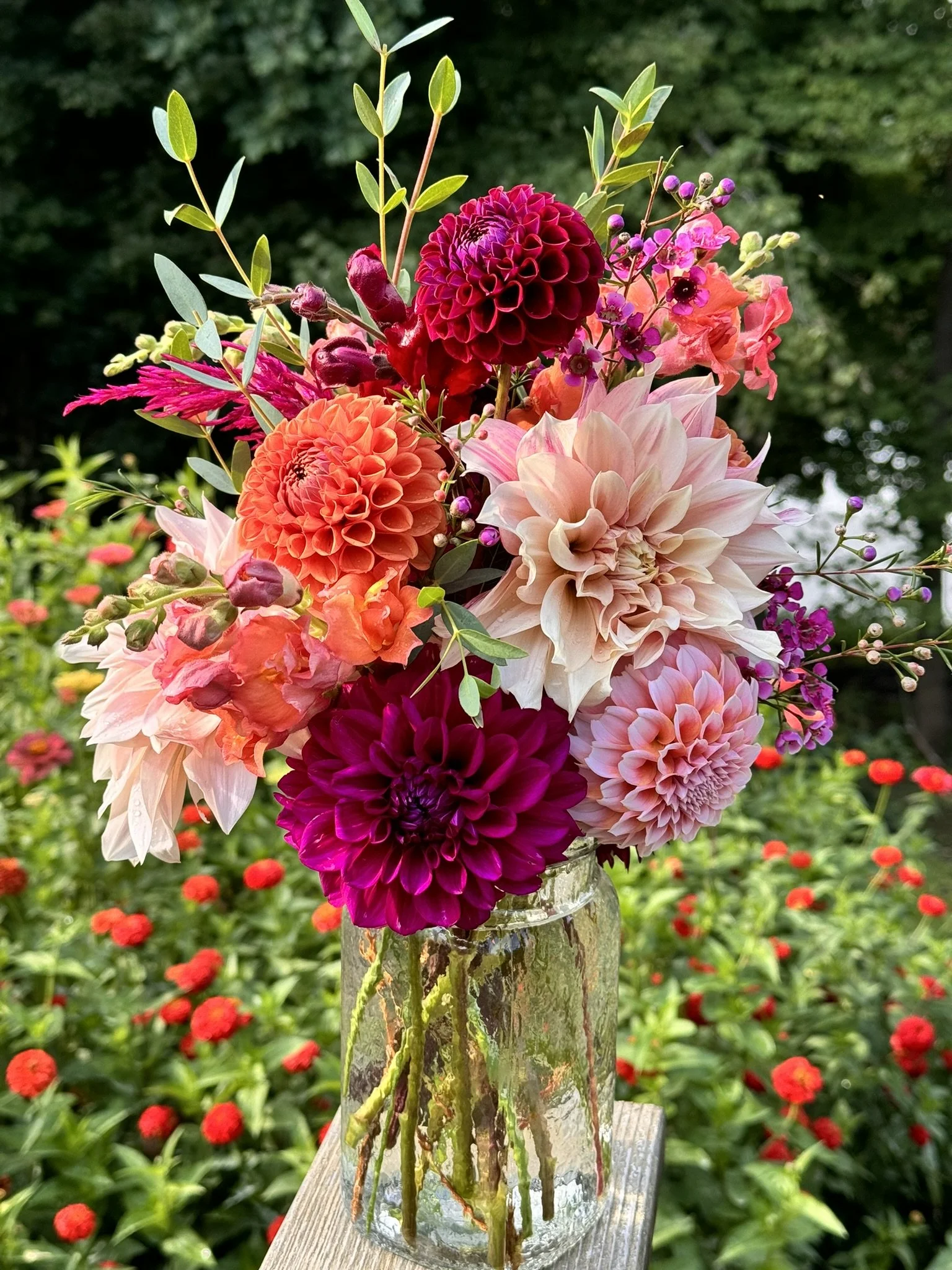 A bouquet of colorful dahlias and assorted flowers in a clear glass vase outdoors with greenery in the background.