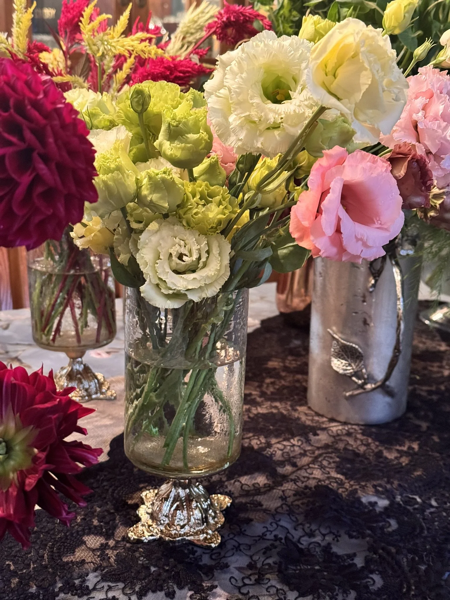 A variety of colorful flowers, including green, white, pink, and red blossoms, arranged in glass vases on a black lace tablecloth.